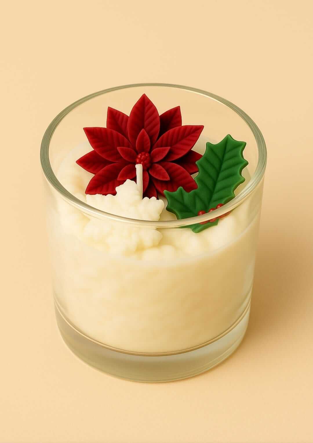 Handgegossen in einem zeitlosen Glas, mit einer Wachstextur, die an Schnee erinnert, und einer Dekoration aus Weihnachtsstern und Christdorn – liebevoll gestaltet mit kleinen, zauberhaften Details.